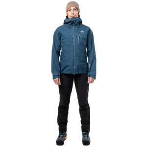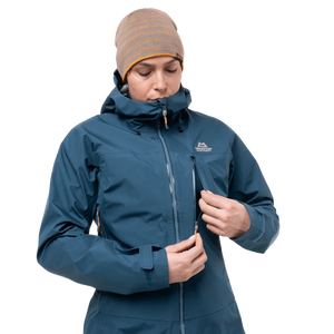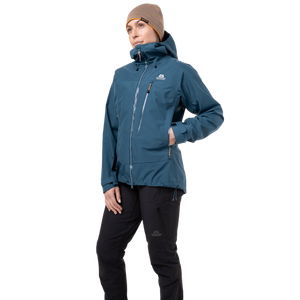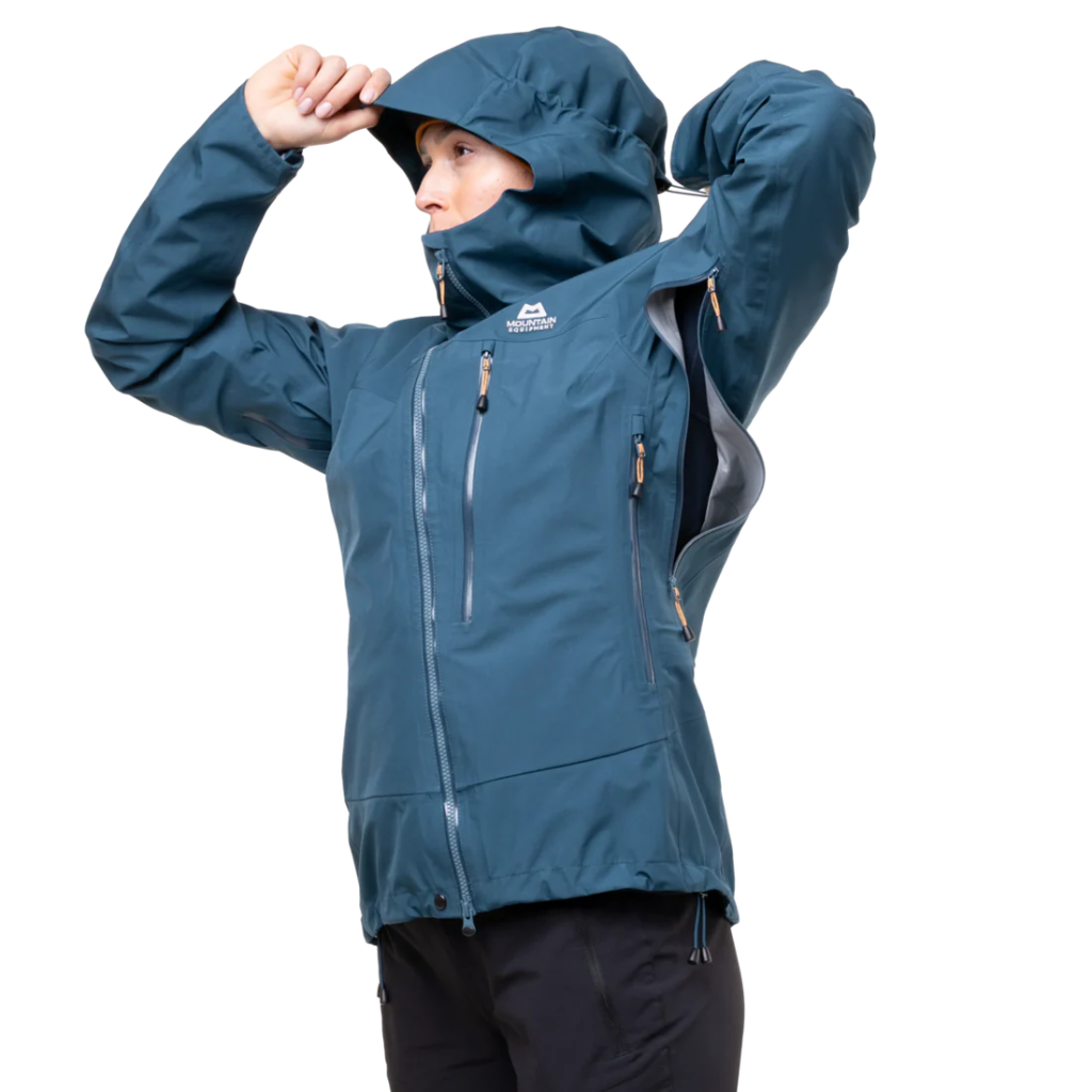 The spacious and adjustable hood is designed to be compatible with a peaked helmet, providing a secure fit even in strong winds. The Alpine Fit minimizes extra fabric, preventing flapping or bunching while still allowing for dynamic movement, such as coiling ropes, carrying packs, or using axes. The hem drawcords and laminated cuffs are adjustable for layering and effectively block out rain, ensuring complete protection in wet weather. Additionally, the jacket features large pit zips for temperature regulation and moisture management during vigorous activities or in humid environments.